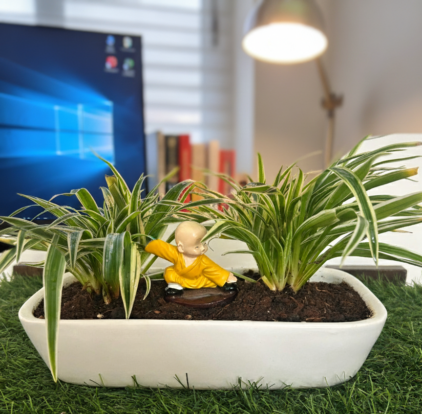 A resilient, fast-growing houseplant (Chlorophytum comosum) known for its air-purifying qualities. This plant features arching, bright green leaves with creamy white stripes down the center (variegation), presented here as a decorative desktop pairing.