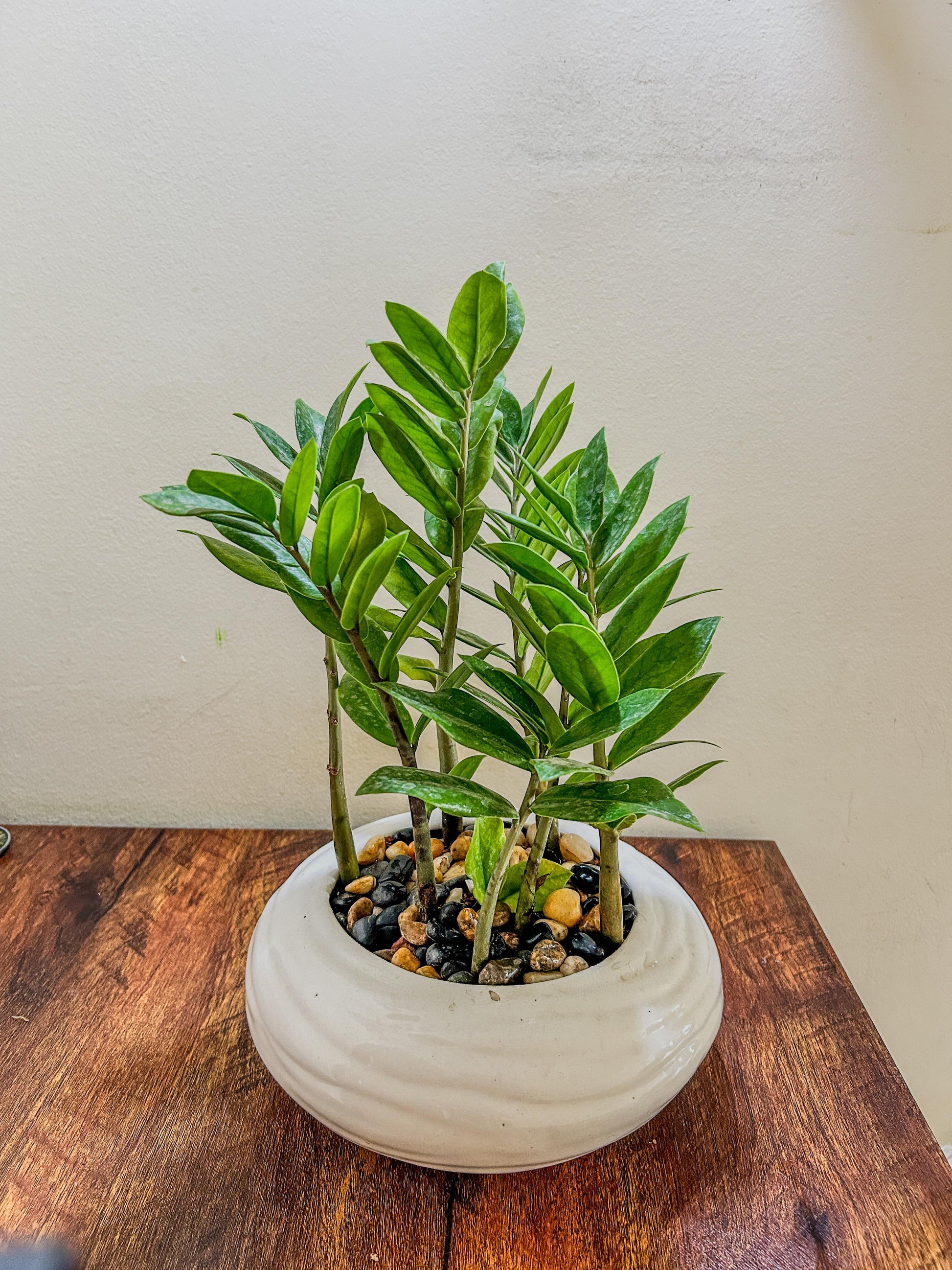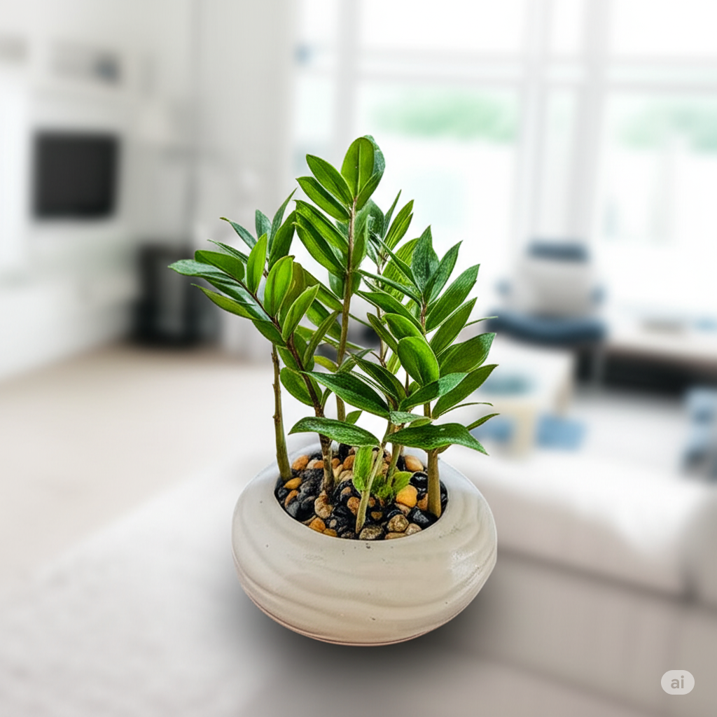 Add a bold, architectural touch to your space with the ZZ Plant, celebrated for its glossy green leaves and sculptural elegance. Nestled in a modern ceramic pot with a mix of natural pebbles, it’s a perfect statement piece for homes and workspaces alike.