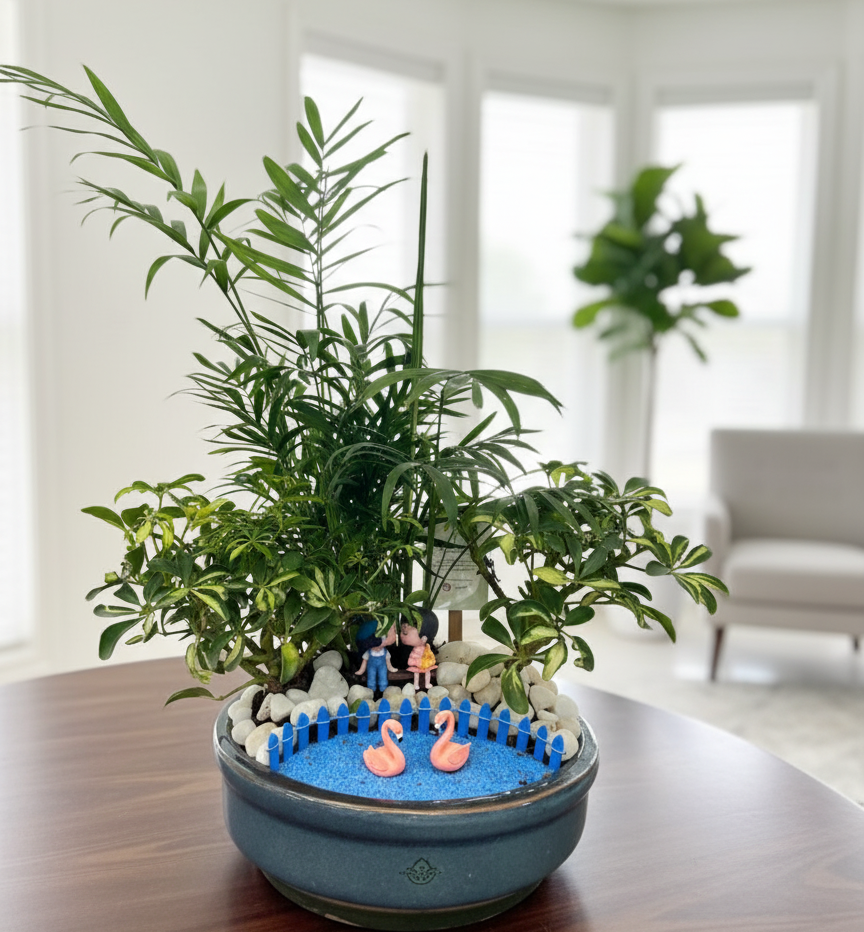 Premium handcrafted desk & home décor planter featuring vibrant greens paired with playful flamingo accents and miniature figurines. Designed to bring freshness, positivity, and elegance to any space while doubling up as a unique green gifting option.