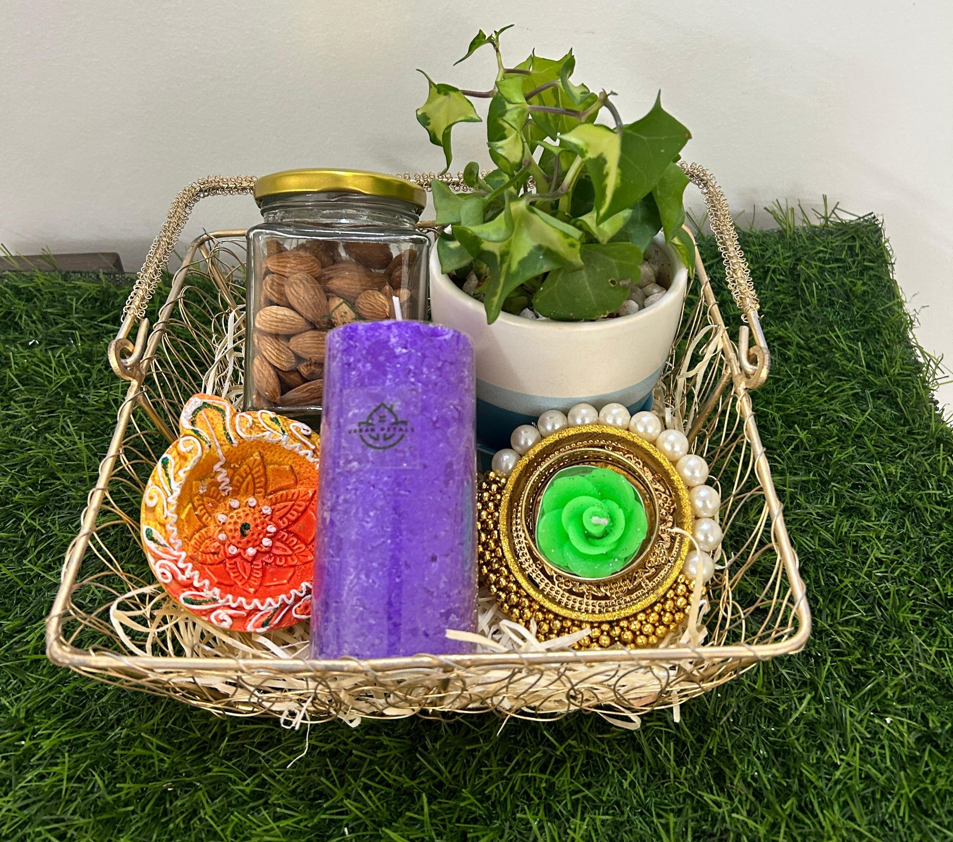 Festive gift hamper beautifully arranged in a rustic woven basket with a natural aesthetic.
