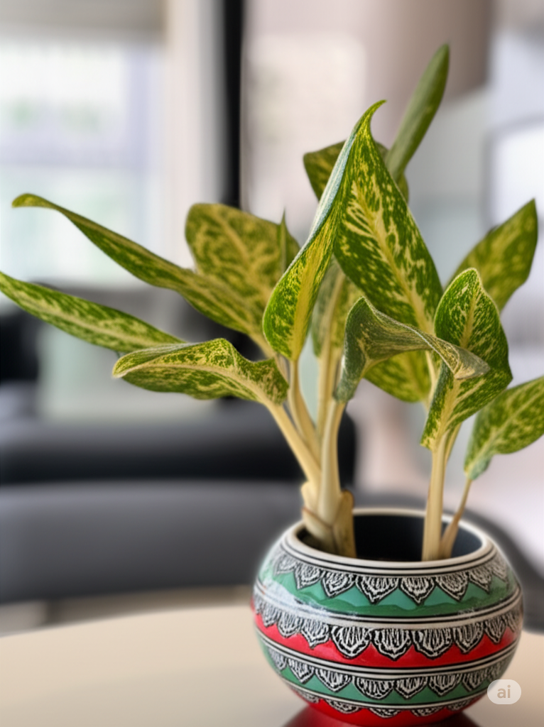 A vibrant Aglaonema (Chinese Evergreen) nestled in a traditional, hand-painted ceramic planter — a perfect blend of nature and culture, ideal for gifting or home décor.