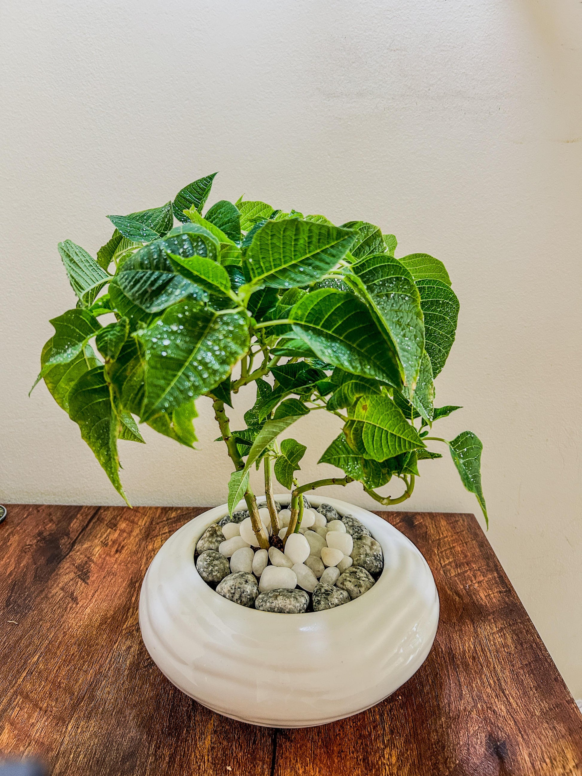 Elevate your interiors with this beautifully structured green companion, potted in a chic ceramic planter and adorned with natural white and grey pebbles.