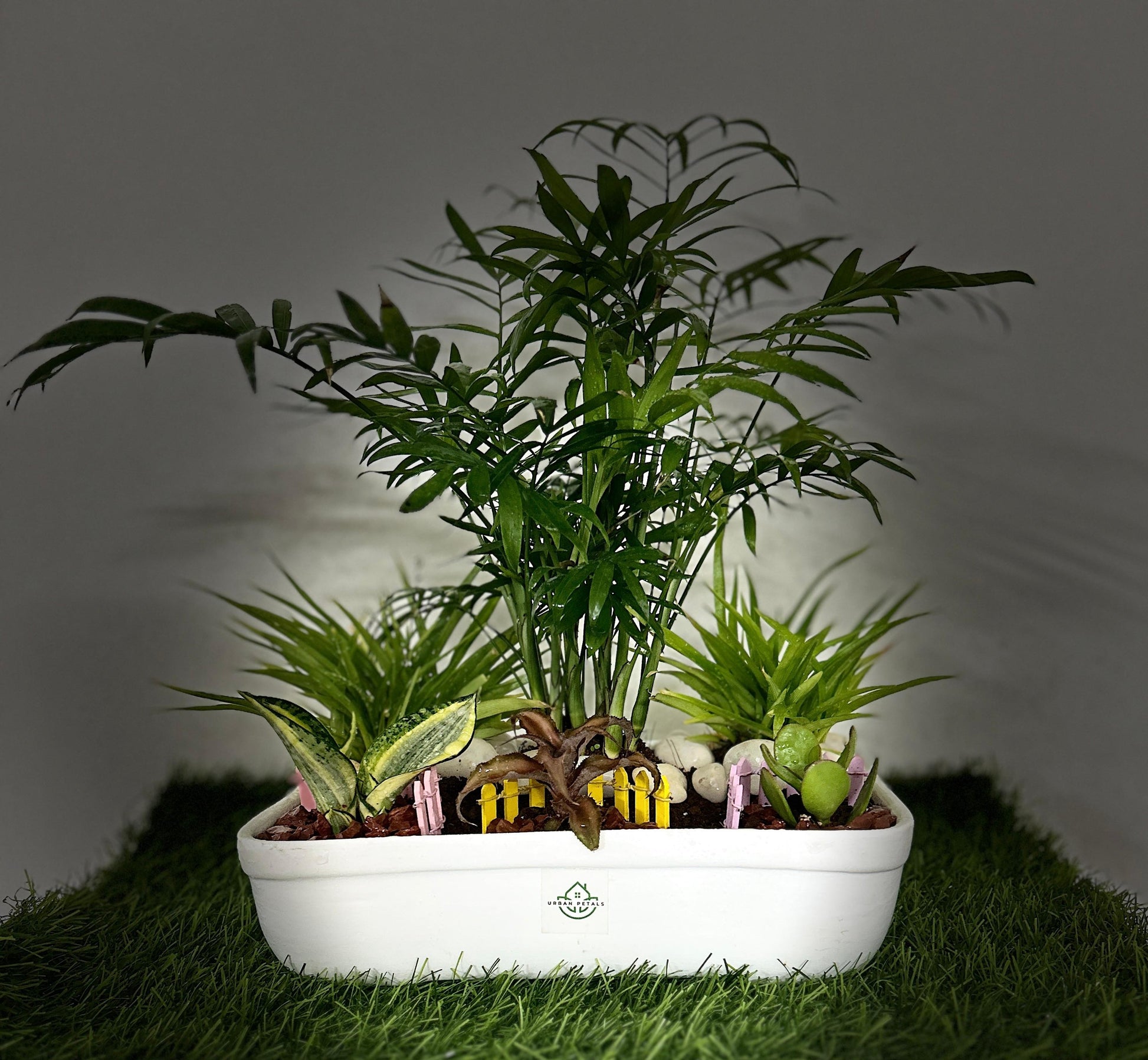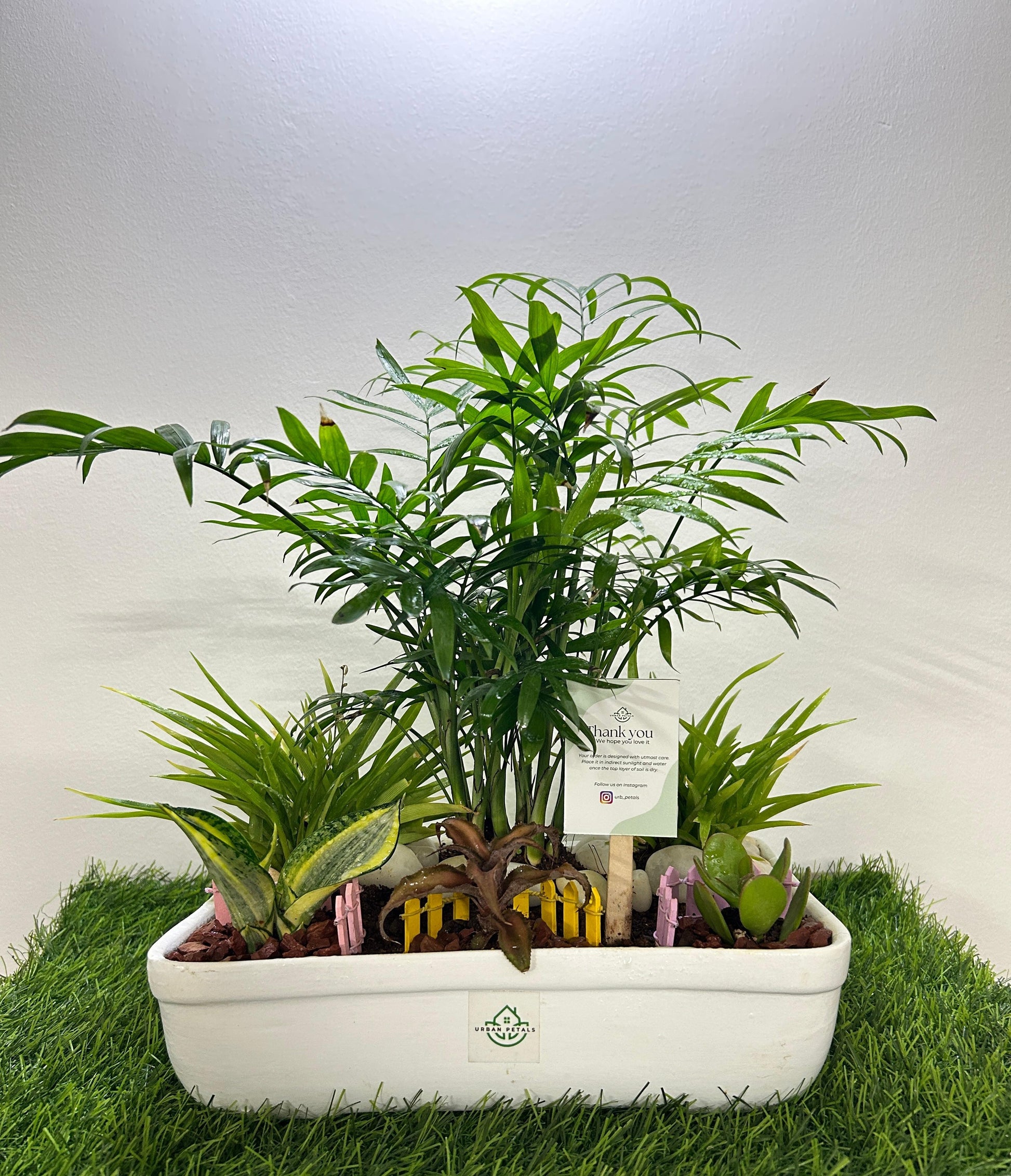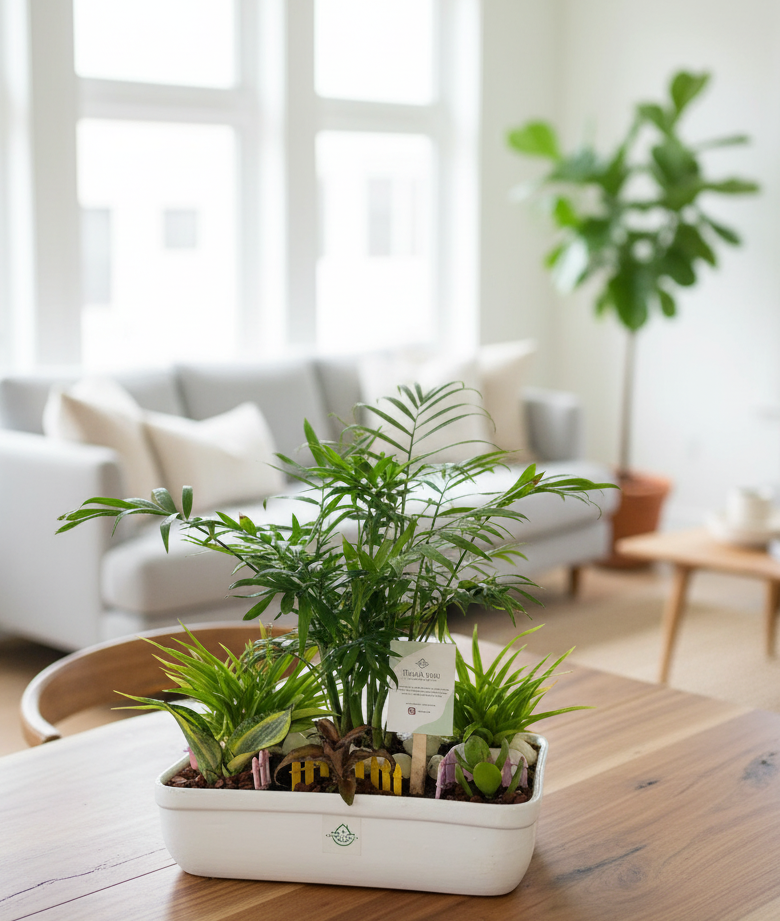 Thoughtfully curated mix of low-maintenance indoor plants like Chamaedorea Palm, Snake Plant, and Jade, set in a modern white ceramic planter. Perfect for adding freshness to your space while also making a sustainable and elegant green gifting choice.