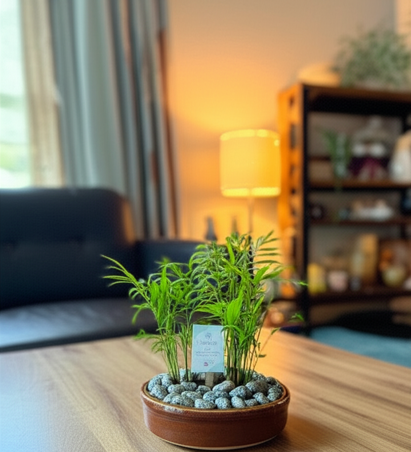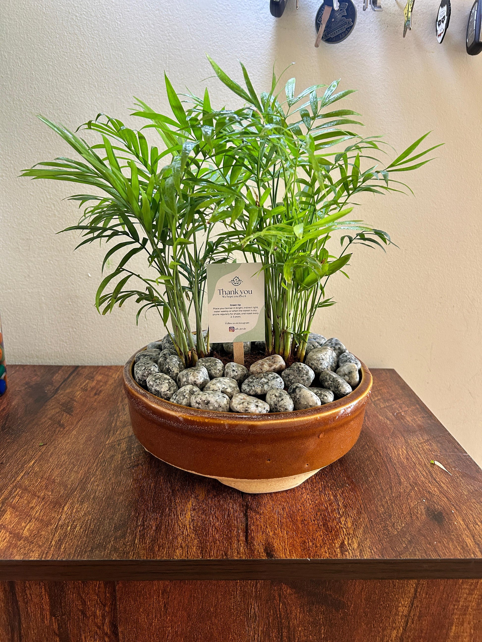 This lush indoor arrangement of Palm in a warm ceramic pot with stones evokes a serene, spa-like ambiance—perfect for a calming corner or desk companion.